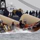 In this Tuesday, April 22, 2014, searchers and divers look for people believed to have been trapped in the sunken ferry Sewol near buoys which were installed to mark the vessel in the water off the southern coast near Jindo. Jindo, South Korea: The grim work ...